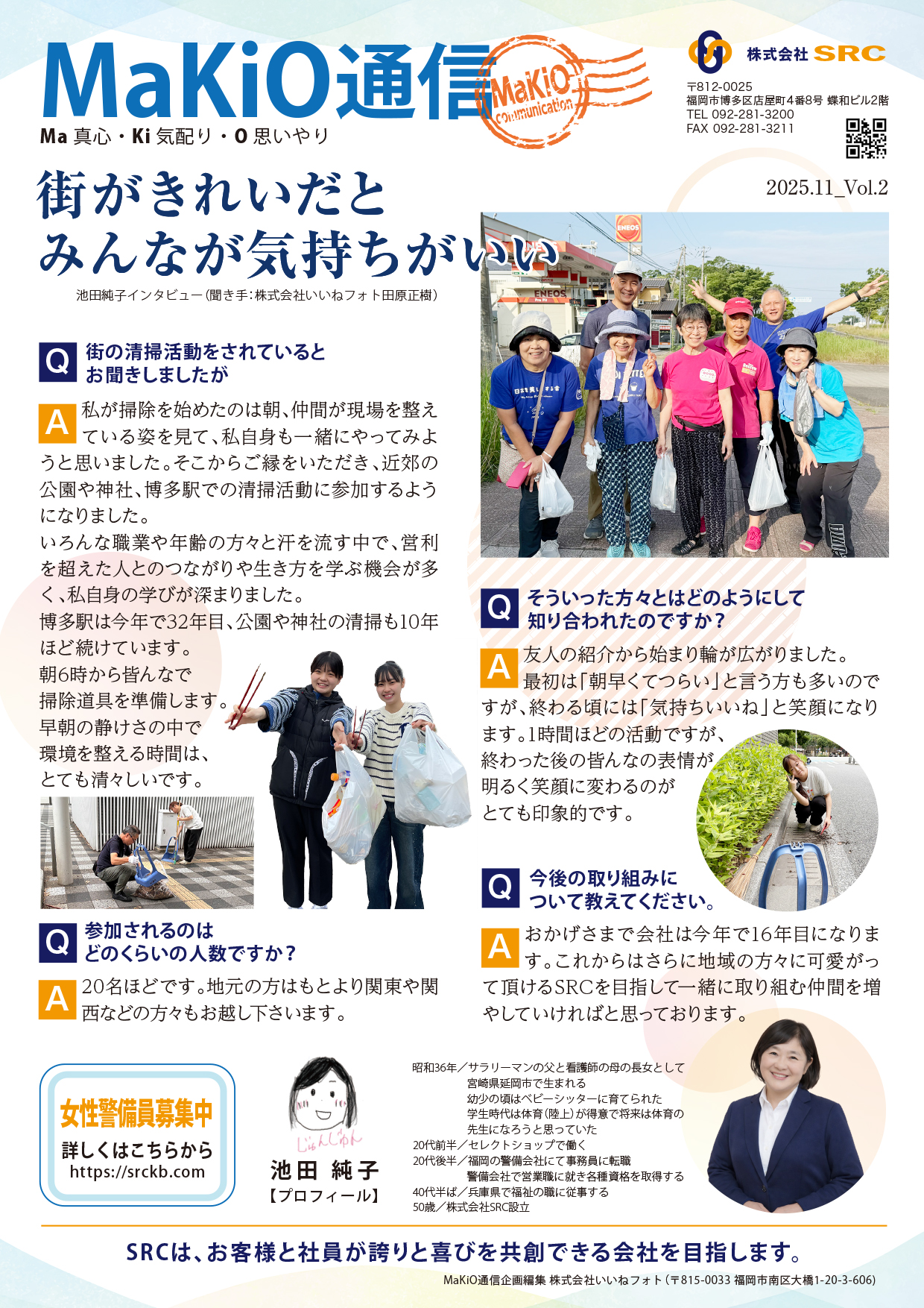 今号の特集では、長年にわたり早朝の清掃活動を続けている弊社代表取締役・池田純子にインタビュー。